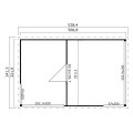 Côté conception, la toiture plate en volige de bois massif est livrée avec un feutre bitumeux inclus pour une première protection, tandis qu’une onduline en option peut être ajoutée pour renforcer l’étanchéité. Ses proportions équilibrées (322 x 509 cm au sol, 529 x 342 x 239 cm hors tout) et sa hauteur de 239,4 cm lui confèrent un volume intérieur agréable et spacieux.