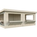 Son toit plat apporte une touche contemporaine qui s’adapte à tous les environnements, qu’il s’agisse d’un marché local, d’un salon professionnel ou d’un village de Noël. Plusieurs options sont disponibles pour personnaliser votre installation selon vos besoins : couverture en epdm, gouttière, plancher de sol... tout a été prévu pour que votre abri bois pour commerce local soit à la fois esthétique et pratique.