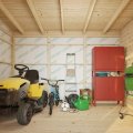 Les portes isolées en polystyrène expansé PSE 50 de 32 mm, renforcées par un panneau de fibres dur, ajoutent une vraie valeur en protégeant efficacement le contenu. Le plancher en lames de 19 mm est inclus, tout comme la toiture assortie, couvrant 19 m² avec une pente moderne à 15°. Poignée, cache-serrure et charnières robustes garantissent un usage confortable au quotidien.