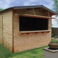 Côté menuiserie, l'abri est doté d'une porte latérale simple, équipée d'une serrure à clefs, permettant un accès sécurisé à l'intérieur du stand de marché en bois. Une large fenêtre ouvrante, type comptoir, facilite l'interaction avec vos clients tout en assurant une bonne ventilation. Que vous recherchiez un chalet de Noël en bois ou un stand mobile en bois pour vos marchés saisonniers et événements extérieurs, ce kiosque comptoir en bois combine design fonctionnel et robustesse, offrant un abri fiable pour vos ventes en plein air.