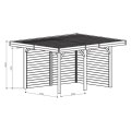 La structure de ce carport en bois pour 1 voiture repose sur des poteaux de 120 mm d'épaisseur, offrant une stabilité optimale, tandis que les parois de 28 mm assurent une isolation supplémentaire. La hauteur de passage de 231 cm et la largeur de 270 cm entre les poteaux permettent un stationnement confortable, même pour des véhicules plus volumineux. Le toit plat en acier laqué gris foncé complète l'ensemble, apportant une protection renforcée et une esthétique moderne.