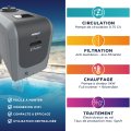 Le Poolican va au-delà des attentes en ajoutant une pompe à chaleur réversible de 5 kW, garantissant une eau toujours à la température idéale pour votre confort. Entièrement intuitif, il assure le traitement complet de votre piscine, jusqu'à un volume de 25 m³, avec une simplicité d'utilisation inégalée.