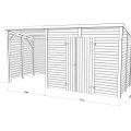Avec ses 8,7 m² de toiture et sa structure monopente de 12°, cet abri de jardin avec bûcher 7m2 protège efficacement vos outils et votre bois de chauffage. L’espace fermé de 4,5 m² permet de stocker le matériel à l’abri, tandis que l’auvent de 2,9 m² accueille vos bûches en toute saison.