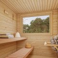 Ce sauna compact 3 personnes repose sur une structure robuste en madriers de 44 mm, avec montage par emboîtement traditionnel. La pièce chauffée est équipée de bancs à deux niveaux avec dossiers ainsi que d’un garde-corps en tremble sécurisant la zone du poêle (en option). L’ambiance y est douce et agréable, grâce à une isolation de 30 mm dans le plafond, un revêtement en bois de 16 mm et une fenêtre fixe qui laisse entrer la lumière naturelle. La circulation de l’air est bien pensée, contribuant à une montée en température homogène et à un confort thermique optimal.